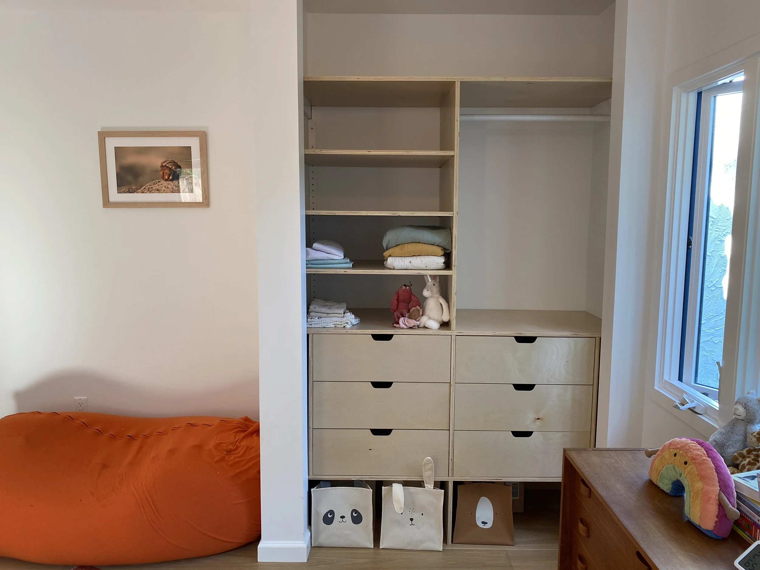 With the arrival of our second baby, we needed to make space in the bedroom and remove the dresser. During our remodel we had framed an empty closet and it was time to make the cabinetry.